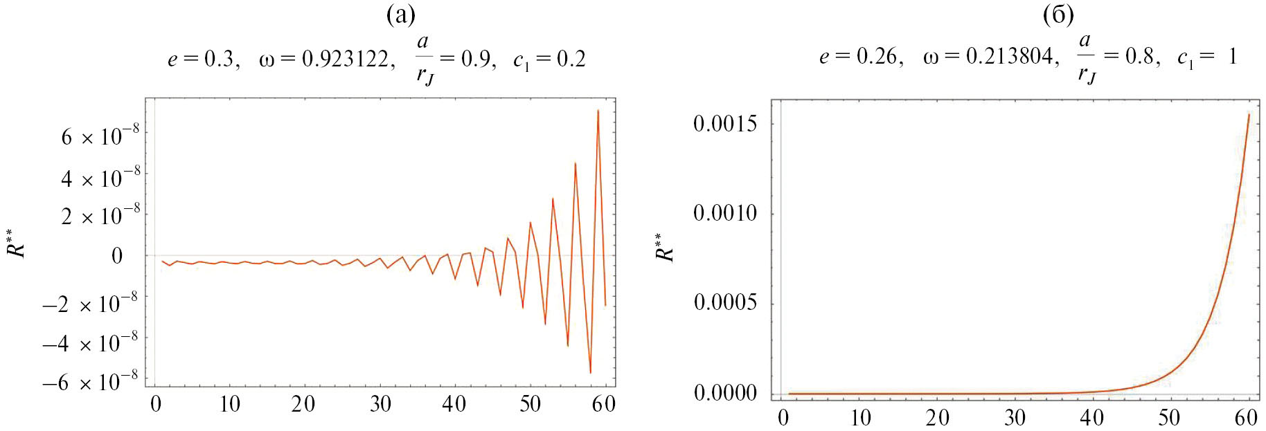 На рис. 6а представлено значение пертурбационной функции (12) в точке e, ω, удовлетворяющей условию f1 = 0 , i ≠ 0. Частичная сумма первых сорока членов ряда (12) хорошо приближает усредненную пертурбационную функцию R∗∗ задачи, и только удержание бóльшего количества членов ряда приводит к его расходимости. Таким образом, ряд (12) является асимптотическим по Пуанкаре, при этом расходимость ряда сопровождается осциллирующим нарастанием амплитуды колебаний. На рис. 6б имеем вековой уход значений пертурбационной функции с ростом числа удерживаемых членов ряда (случай i = 0).