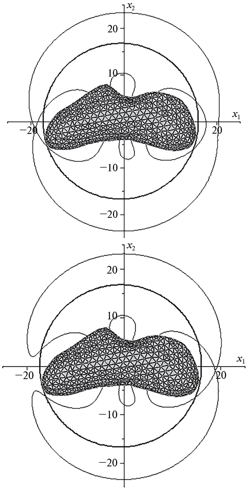 Для изображения областей возможного движения обычно используют те или иные их сечения. Ограничимся изображением сечения плоскостью, проходящей через коллинеарные точки либрации и ортогональной оси вращения астероида. Эти тройки изображены на рис. 1. Полужирные окружности на рисунках — сечения сферы, описанной около астероида. Нетрудно видеть, что вычисленные коллинеарные точки либрации находятся вблизи этой сферы, чем и может быть вызвано описанное выше парадоксальное снижение точности с увеличением порядка приближения.
