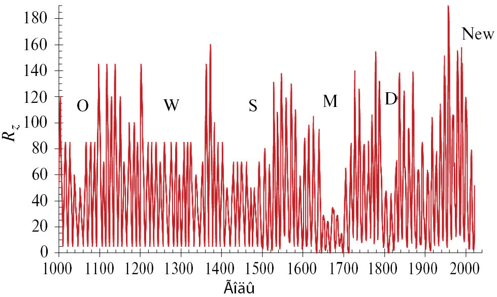 В работе [4] было спрогнозировано, что новый глубокий минимум солнечной активности должен наступить в начале этого тысячелетия, а следующий за ним – в период 1170~2200 гг. [4]. Это также показано на рис. 2. В настоящее время наблюдается глубокий минимум солнечной активности [4].
