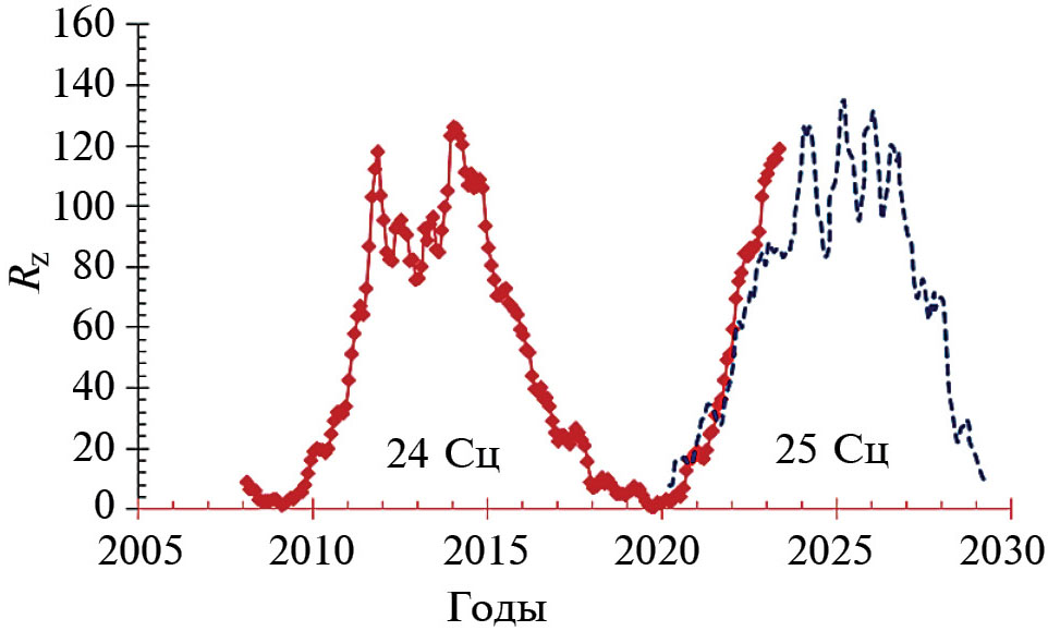 Все глубокие минимумы солнечной активности в прошлом характеризовались значительным уменьшением числа солнечных пятен Rzmax в максимуме 11-летнего СЦ (рис. 1) [1]. Не является исключением и настоящий глубокий минимум солнечной активности. В 23-м СЦ (последним перед глубоким минимумом) среднегодовое максимальное число солнечных пятен было равно Rzmax ≈ 250 (2002 г.). В 24-м СЦ (начало современного глубокого минимума) Rzmax = 135, т. е. количество уменьшилось почти в два раза. Ожидается, что 25-й СЦ будет иметь примерно такую же или меньшую величину Rzmax.