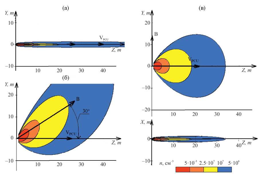 На рис. 1 показаны конфигурации ИПО для разных значений углов α. Такие ИПО, чувствительные к направлению истечения относительно магнитного поля Земли, специалисты называют «корсуноидами» по имени автора — Анатолия Григорьевича Корсуна, первым получившего математическое описание динамики плазменных струй ЭРД на околоземной орбите [17–19].