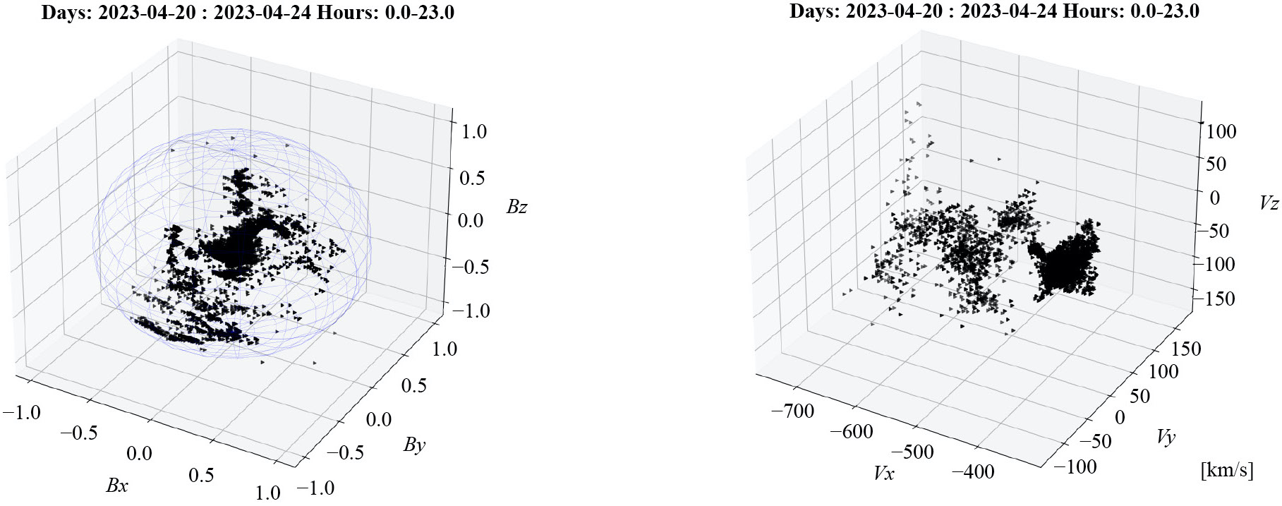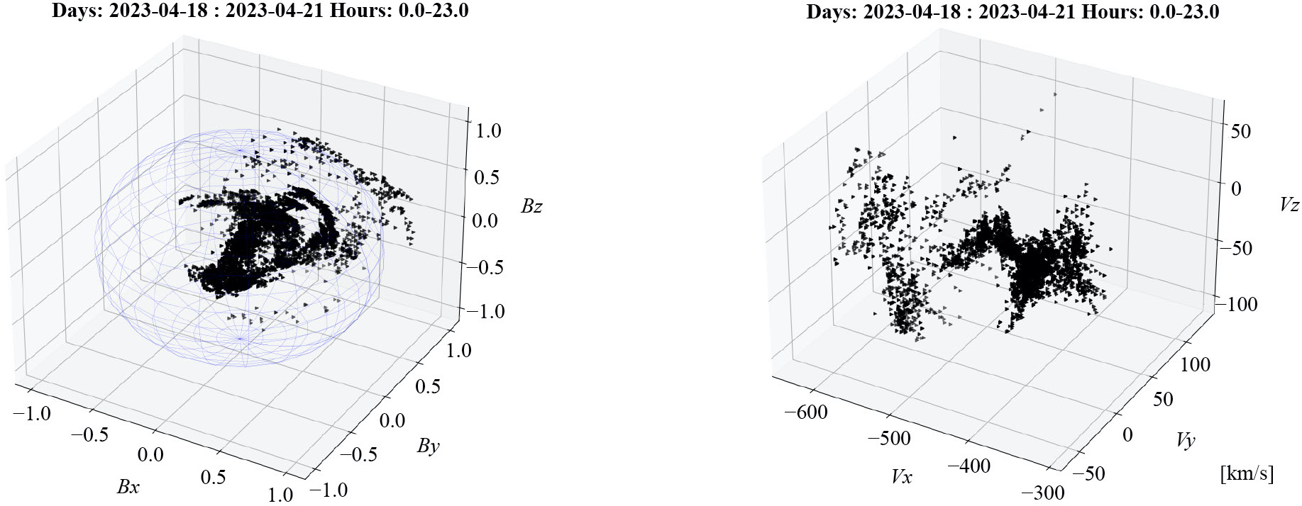 Верхняя строка объединяет графы для вектора магнитного поля и вектора скорости частиц солнечного ветра, построенные для четырехсуточного интервала с 15 до 19 апреля 2023 г., соответствующего невозмущенному режиму межпланетного магнитного поля, аппарат находился в ⊖ секторе магнитного поля Солнца [16]. Определение знака сектора было выполнено на основе анализа недельного временного ряда для Bx-компоненты, прошедшего через фильтр низких частот с окном усреднения в 6000 отсчетов при шаге дискретизации в 60 с. Нижняя группа графов относится к режиму магнитной бури в интервале 20–24 апреля 2023 г., аппарат сместился в положительный сектор магнитного поля Солнца ⨁.