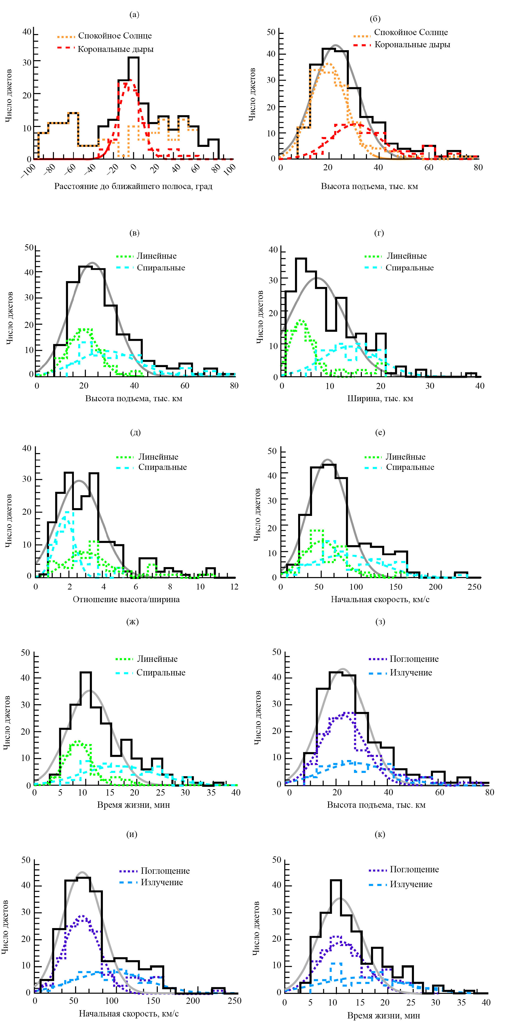 Рис. 3. Распределение основных измеренных характеристик солнечных джетов ВУФ-диапазона. Отдельно показаны джеты, зарегистрированные в областях спокойного солнца и в корональных дырах (а, б), линейные и спиральные джеты (в–ж) и джеты, имевшие заметное поглощение или излучение в каналах 171 и 193 Å (з–к)