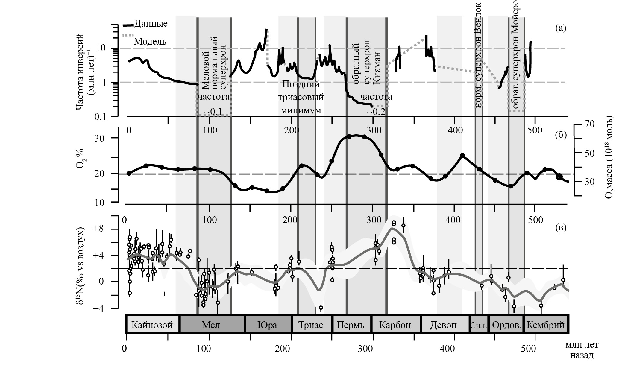 На рис. 1 показаны частота инверсий (а), уровень / масса кислорода (б) и изменение соотношения изотопов азота (в) в течение фанерозойской эры (0–550 млн лет назад; отсчет ведется от современной нам кайнозойской эры). Временные интервалы массовых вымираний и суперхронов (включая периоды редких инверсий) заштрихованы, соответственно, вертикальными светло- и темно-серыми полосами.