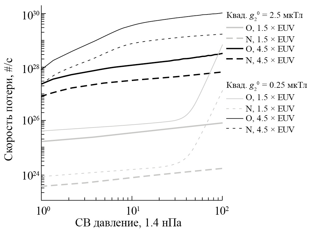 Рисунок 5 демонстрирует суммарные скорости потери O+ и N+ для квадрупольного магнитного поля с мкТл (тонкие кривые) и мкТл (толстые кривые) во время инверсии в зависимости от давления СВ при разных уровнях EUV-излучения. В случае небольшого EUV-излучения (в 1.5 раза выше современного) собственное магнитное поле обеспечивает отток тяжелых ионов из полярных шапок и каспов для всех рассматриваемых значений давления СВ при мкТл и для значений давления СВ менее 30 нПа при мкТл. При высоком EUV-излучении (в 4.5 раза выше современного) магнитное поле не может защитить ионосферу от прямого воздействия СВ, что приводит к значительным потерям ионов даже при слабом давлении СВ.