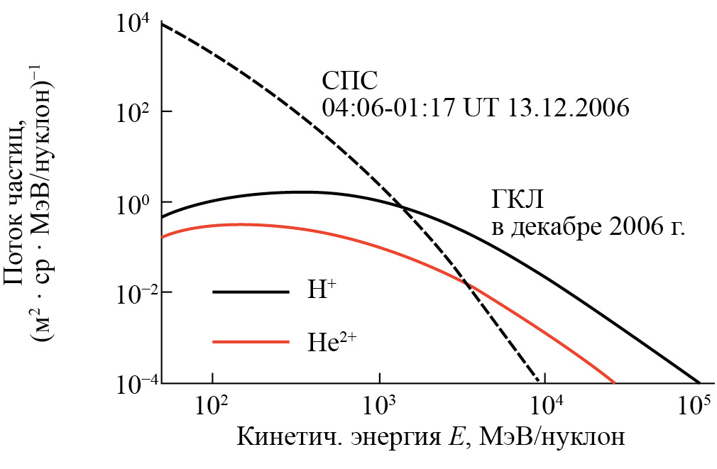 Для моделирования первичных частиц ГКЛ использовался стандарт ГОСТ 25645.150-90. В модели данной работы предполагалось, что ГКЛ на 92 % состоят из протонов и 8 % из ядер гелия. В качестве СПС анализировалось событие, произошедшее 13 декабря 2006 г., т. е. почти в минимуме солнечной активности. Спектр данного события можно смоделировать при помощи функции Вейбулла [м–2 ср–1 с–1 МэВ–1], где коэффициент k = = 2·107; показатель степени b = 0.26; энергия излома спектра E0 = 0.1 МэВ [7]. Энергетические спектры первичных частиц ГКЛ и СКЛ во время СПС представлены на рис. 1.