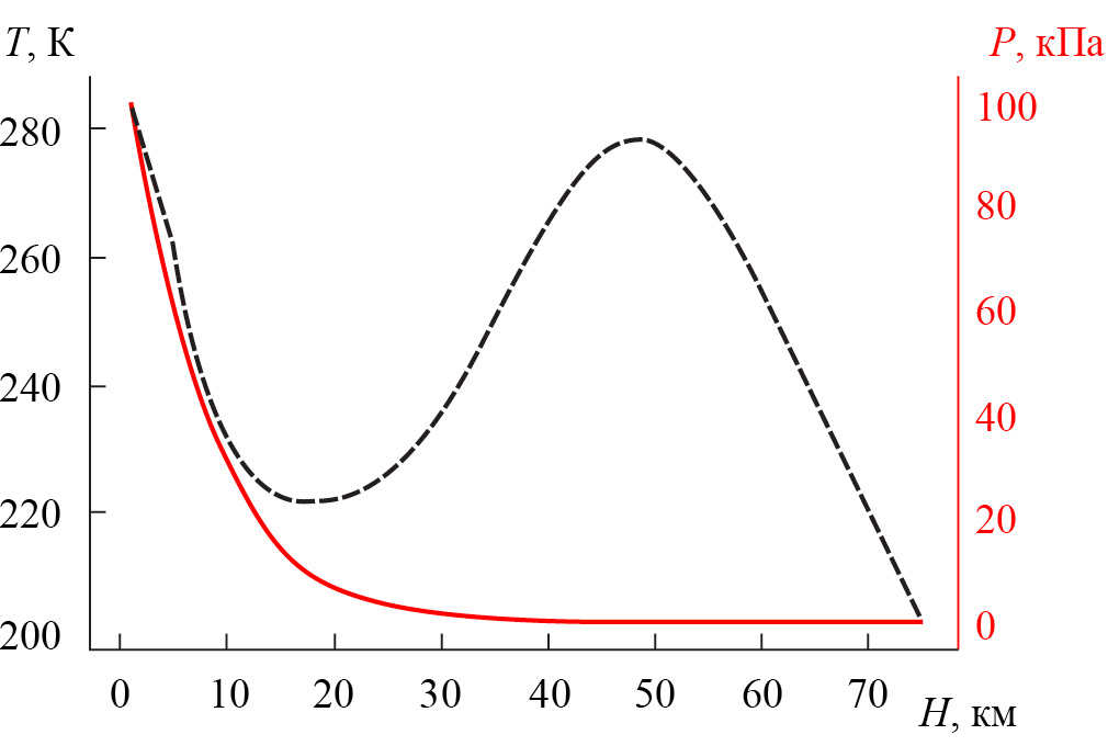 Рис. 2. Зависимость температуры (черная пунктирная кривая) и давления (красная сплошная кривая) современной атмосферы от высоты