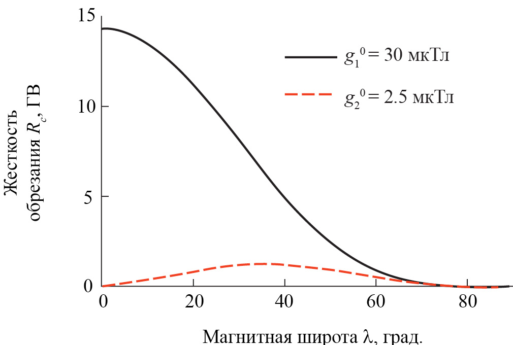 Динамика заряженных частиц в магнитном поле характеризуется магнитной жесткостью , где R – жесткость частицы в ГВ; p – ее импульс; c – скорость света; | q | – заряд частицы. Частицы с одинаковой жесткостью имеют одинаковый ларморовский радиус и движутся по одинаковым траекториям. Минимальная жесткость, при которой заряженная частица из космоса может достичь заданной точки околоземного пространства, называется жесткостью геомагнитного обрезания Rc.