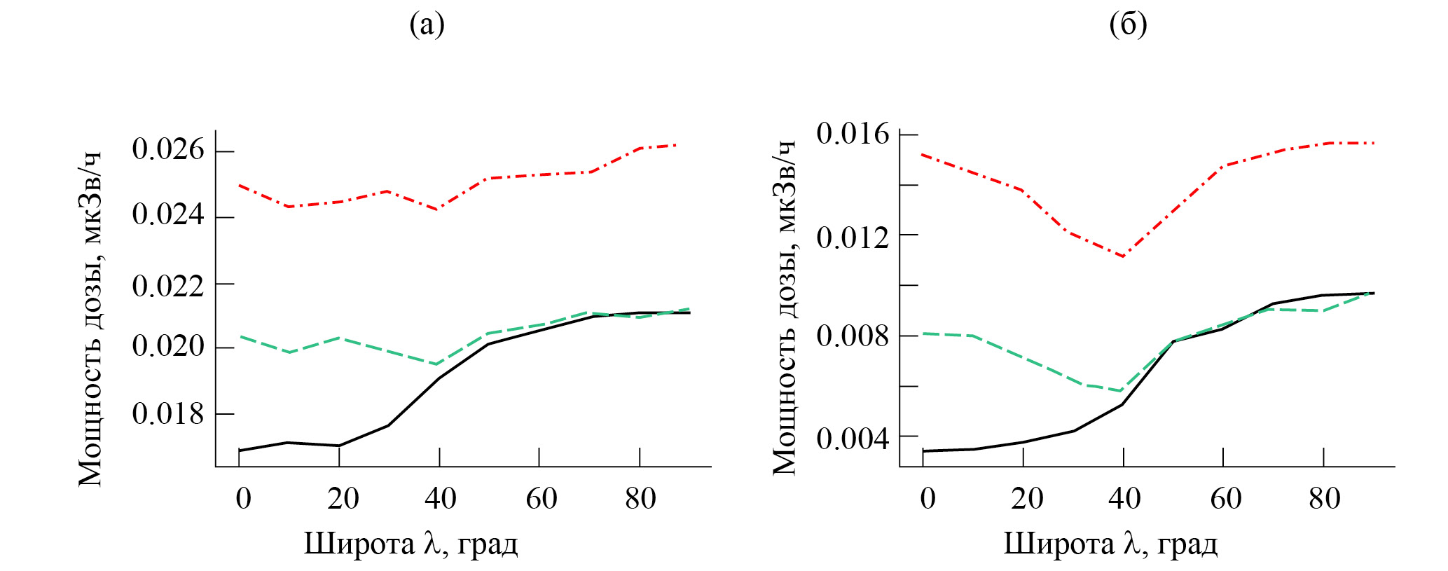 Радиация, которую несут с собой КЛ даже сегодня, при сильном геомагнитном поле, может негативно сказаться на работе высокотехнологичного оборудования, расположенного в районе полюсов. Для того чтобы разобраться, с какими уровнями радиации человечество может столкнуться в момент инверсии, в настоящем исследовании были рассчитаны мощности доз радиации от ГКЛ и СКЛ во время СПС для различных сценариев на ключевых высотах. ГКЛ, обладающие высокой энергией, проходят порог геомагнитного обрезания на всех широтах даже при сильном геомагнитном поле. На рис. 4 приведены мощности доз радиации от ГКЛ в мкЗв/ч в зависимости от широты λ на высоте 10 км, где обычно летают самолеты. Черный график отображает мощности доз радиации для современной эпохи, зеленый – для случая однократной инверсии, красный – для случая множественных инверсий, когда атмосфера разрежена. Из графиков следует, что существенная разница в радиации на этой высоте для обоих сценариев инверсии будет наблюдаться только на низких широтах.