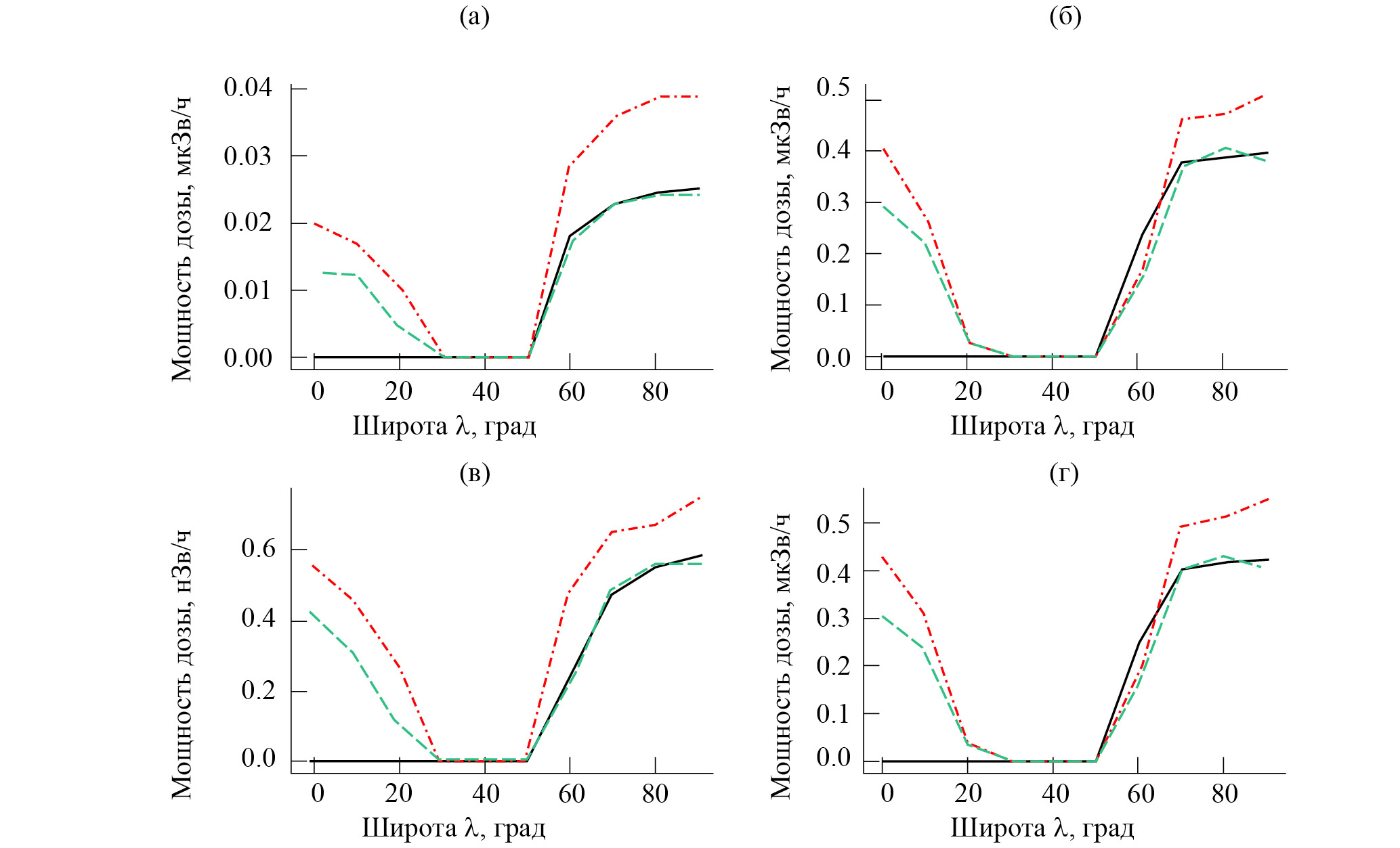 Частицы СКЛ обладают куда меньшей энергией, по сравнению с ГКЛ. Однако во время сильных СПС солнечные протоны с энергией, превышающей порог геомагнитного обрезания на средних широтах, могут превалировать над протонами ГКЛ. На рис. 7 приведены мощности доз для выбранного СПС в зависимости от широты на высоте 10 км для протонов (а), нейтронов (б), электронов (в) и мощности суммарных доз для всех частиц (г).