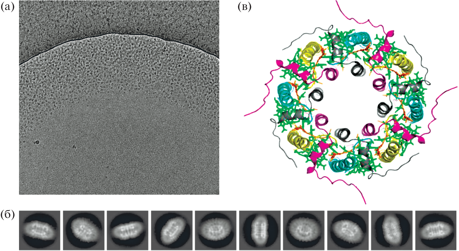 Первичные процессы фотосинтеза у пурпурных фотосинтезирующих бактерий происходят в светособирающих комплексах (Light-Harvesting, LH). В состав комплекса LH2 входят полипептиды, бактериохлорофилл и в большинстве случаев каротиноиды. Известны три пространственные структуры комплексов LH2 из пурпурных несерных бактерий, однако для пурпурных серных бактерий структуры с высоким разрешением не установлены. Описываются структурные исследования двух светособирающих комплексов LH2 из пурпурной серной бактерии Ectothiorhodospira haloalkaliphila, проведенные методом криоэлектронной микроскопии. Получены изображения каротиноидсодержащего (LH2+) и бескаротиноидного (LH2–) вариантов комплекса, демонстрирующие характерную архитектуру объектов данного типа. Проведена трехмерная реконструкция LH2+ с разрешением 4.5 Å, совпадающая с ранее установленной кристаллической структурой. Для LH2– показано наличие частиц различной морфологии.