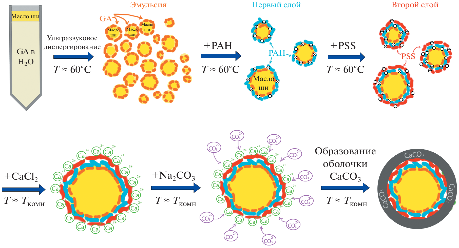 The calcium-carbonate-induced mineralization of multilayer shells of emulsion capsules, formed using layer-by-layer assembly of polyelectrolytes, has been investigated. Optimal conditions for forming microcapsules with a core from shea butter and an organic–inorganic shell from synthetic polyelectrolytes and calcium carbonate are found. The shell morphology and stability of capsules in an aqueous suspension upon heating are investigated, and their cytotoxicity for human fibroblast cells is estimated. It is shown that mineralization of emulsion polyelectrolyte capsules by calcium carbonate in the form of vaterite strengthens the capsule walls and increases their biocompatibility.