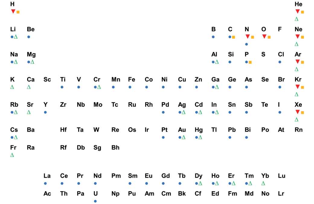 Рис. 1. Химические элементы, применяемые в источниках ионов разных типов: ■ – на основе газовой плазмы [5, 6, 10–16], ▼ – газовые автоионные источники [6–8, 17–22], ● – электрогидродинамические [2–4, 23], Δ – с магнитооптической ловушкой [9].
