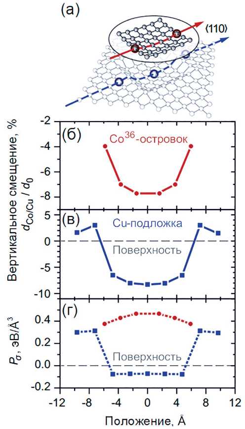 В качестве иллюстрации мезоскопического несоответствия и деформационных релаксаций в эпитаксиальных наноструктурах на рис. 1 показаны смещения атомов в островке Co36 и в прилегающем участке подложки вдоль направления поверхности Cu(001) [13]. Из рисунка видно, что помимо выраженных внутриплоскостных релаксаций в системе имеются сильные внеплоскостные смещения. Атомы подложки под островком вдавлены вниз, в то время как по краям островка они приподняты. Среднее относительное смещение, определяемое из анализа длин связей, в слое подложки под кластером в плоскости поверхности отрицательно, т. е. атомная структура подложки находится под действием напряжения сжатия. Описанные релаксационные эффекты также были установлены в структурах Co на Cu(111), где убедительно показали общую применимость концепции мезоскопического несоответствия к различным структурам, сформированным на ранних стадиях эпитаксии тонких пленок. Кроме того, на основе проведенных расчетов был впервые предоставлен доступ к локальной (атомного уровня) картине напряжений и деформаций, который даже современные экспериментальные методы не могут пока обеспечить в достаточной степени. Так, на рис. 1г показано атомарно разрешенное гидростатическое напряжение Pσ = Tr (σαβ) в островках Co36 и в поверхностном слое Cu [13]. Как видно из рисунка, атомный слой меди вблизи края островка испытывает сильное растягивающие (положительное) напряжение, в то время как слой подложки под островком испытывает сжимающее (отрицательное) гидростатическое напряжение. Различное растягивающее напряжение наблюдается в центре и на крае кластера, что указывает на необходимость рассматривать несоответствие с мезоскопической, а не с макроскопической точки зрения.