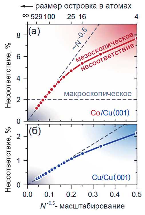 В настоящее время под обобщающим названием “мезоскопическое несоответствие” (mesoscopic misfit или mismatch) принято понимать деформации поверхностей и наноструктур на них, вызванные многочисленными эффектами, связанными с конечными размерами системы или принципиальным несовпадением параметров решетки составляющих ее материалов [1]. В [1] попытались объединить результаты и внести некоторый порядок в современное понимание того, как и когда возникает мезоскопическое несоответствие в наноструктурах на металлических поверхностях и какое оно оказывает воздействие на морфологию, рост, электронные и магнитные свойства системы. С развитием концепции мезоскопического несоответствия сегодня стало очевидным его влияние в масштабах длины от сотен нанометров до нескольких ангстрем. Этот диапазон следует иметь в виду, говоря “мезоскопический”, хотя для большей части обсуждаемых эффектов он может быть сужен до пределов от единиц до десятков нанометров.
