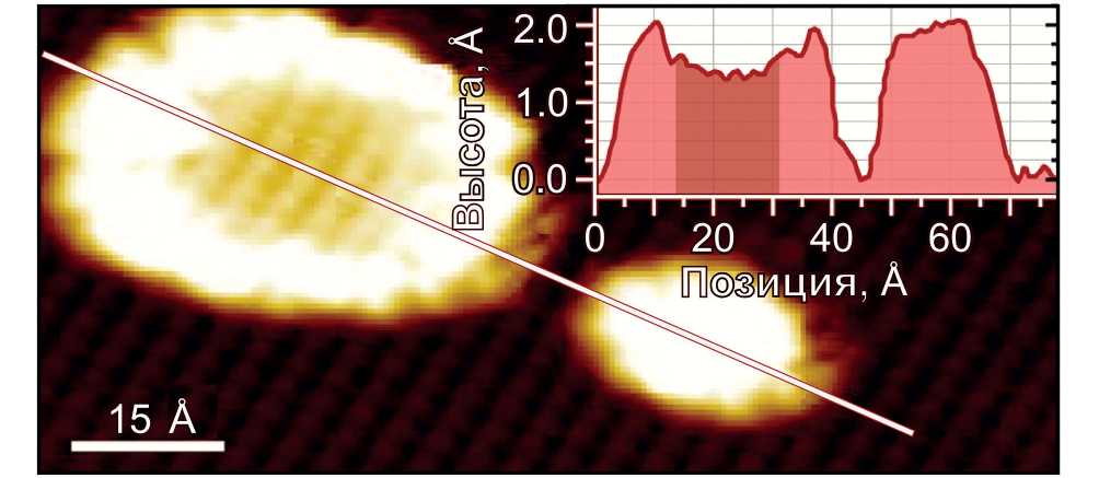 Рис. 5. СТМ-изображение в режиме постоянного тока (8.0 × 3.6 нм2, напряжение смещения 0.2 В, I = 100 пА) двух Fe-островков (∅⊘ ≈ 20 и 35 Å) [15]. На вставке показан видимый высотный профиль вдоль линии. Рисунок адаптирован из [1].