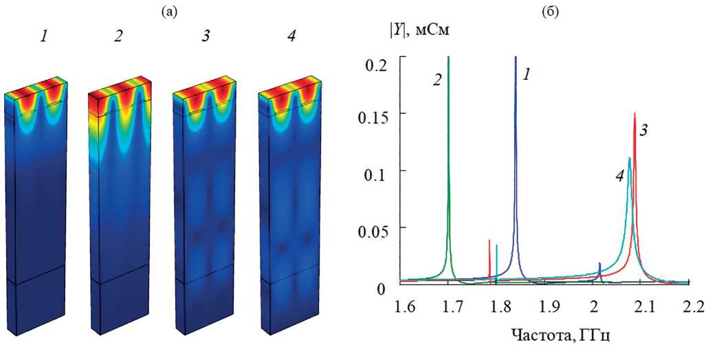 Рис. 3. Картины механических смещений (а) и соответствующие частотные зависимости модуля проводимости периодического преобразователя (б) для различных пьезоэлектрических подложек: 1 – 128°Y–X LiNbO3, 2 – Y–Z LiNbO3, 3 – 64°Y–X LiNbO3, 4 – 49°Y–X LiNbO3.