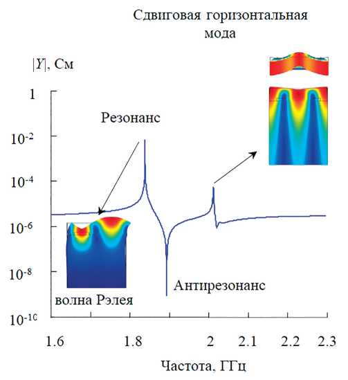 Проведенные исследования проводимости в частотной области периодического преобразователя для структуры SiO2/Al/128°Y–X LiNbO3 показали, что в ней могут распространяться следующие типы акустических мод: