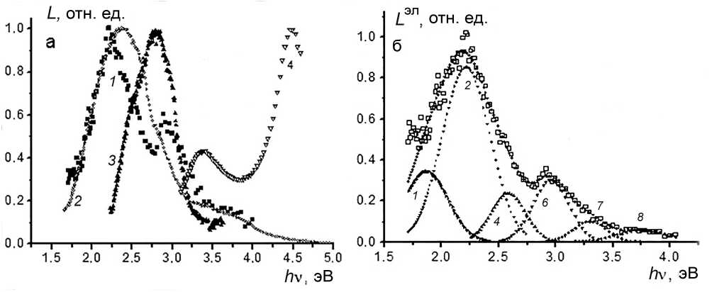 Рис. 1. Спектры ЭЛ (1), КЛ при энергии возбуждения 5 кэВ и токе пучка 5 нА (2), ФЛ при энергии возбуждения 4.1 эВ (3) и возбуждения ФЛ в области 2.8 эВ (4) структур Si–Ta2O5 (100 нм) (а). Пример аппроксимации спектра ЭЛ, номера полос соответствуют номерам в табл. 1 (б).