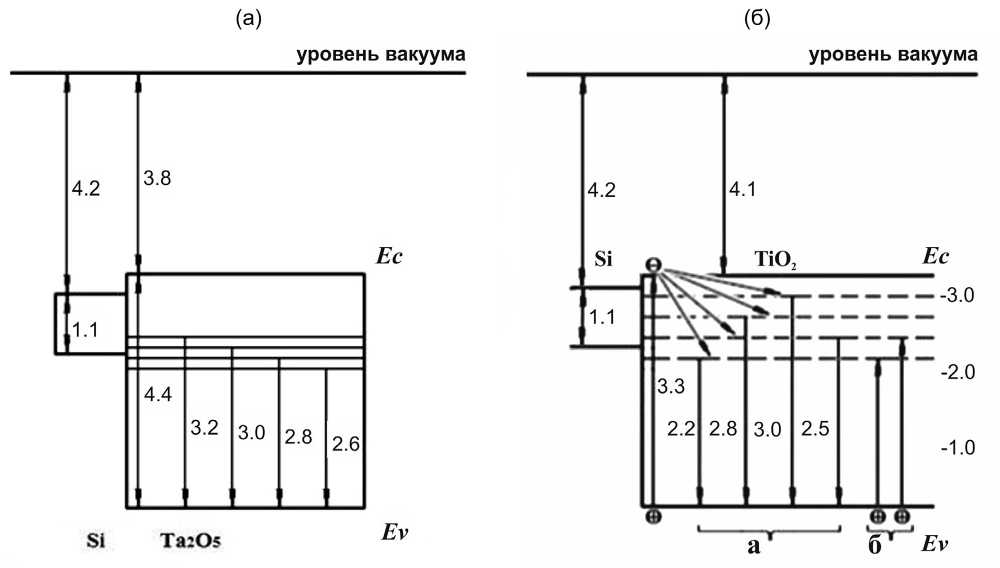 Рис. 5. Электронное строение оксидных слоев Si–Ta2O5 (а) и Si–TiO2 (б).