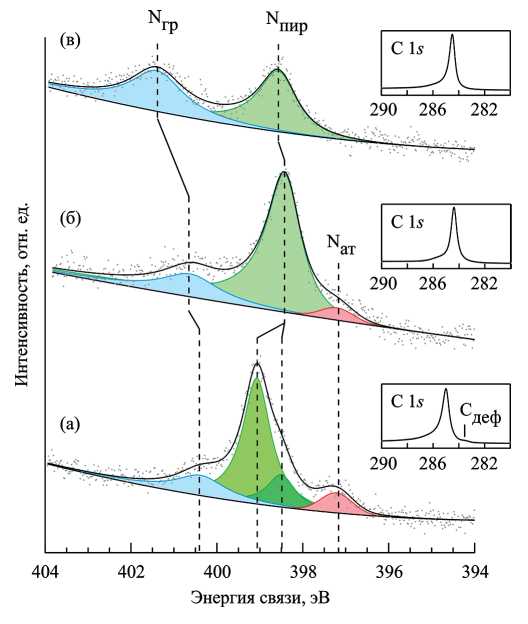 Чтобы сбалансировать количество пиридиновых и графитовых азотных примесей, был проведен продолжительный отжиг образца в вакууме [13]. В ходе данной процедуры атомы углерода, растворенные в подложке при синтезе, могут диффундировать к поверхности и встраиваться в вакансии вблизи пиридиновых атомов азота, приводя к образованию новых графитовых центров. Из соответствующих спектров, представленных на рис. 1в, установлено, что доля графитового азота в результате процедуры конверсии возросла до 45%, однако общее количество азотных примесей снизилось до 1.1 ат. %. Рост числа графитовых примесей также приводит к дальнейшему сдвигу энергетического положения пика Nгр до значения 401.3 эВ. При этом химическое состояние углеродных атомов практически не меняется.