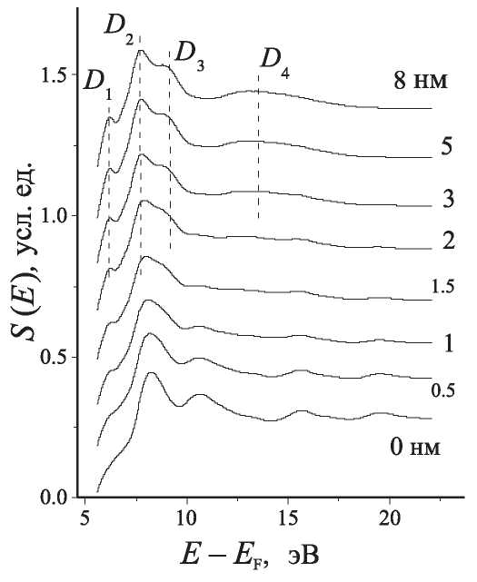 Серия зависимостей ТССПТ, экспериментально измеренная в процессе осаждения пленок DBBA на поверхность ZnO, полученной методом МН, представлена на рис. 3. Формирование максимума ТССПТ при определенном значении энергии соответствует повышению интенсивности входа падающих электронов в исследованную поверхность, что обусловлено повышением плотности разрешенных электронных состояний при данном значении энергии. ТССПТ, соответствующая нулевой толщине органического покрытия, исходит от поверхности подложки ZnO, полученной методом МН. ТССПТ исследованной подложки демонстрирует несколько отчетливых максимумов, в том числе при энергиях 8.0, 11.0 и 16.0 эВ. В процессе увеличения толщины органического слоя ТССПТ подложки затухала, и одновременно нарастала интенсивность новой ТССПТ. При толщине пленки DBBA 8 нм сформировалась стабильная ТССПТ вновь сформированной поверхности с характерными максимумами D1–D4, расположенными при энергиях 7.0, 7.5, 9.0 и 13.5 эВ соответственно (рис. 3). Следует отметить, что максимумы D1–D4 начали появляться на ТССПТ и при меньшей толщине органического слоя, после достижения пленки толщины 2 нм. При увеличении толщины DBBA покрытия более 8 нм ТССПТ практически не изменялась, а при толщине более 10 нм продолжение осаждения приводило к искажениям ТССПТ вследствие зарядки поверхности под действием падающего электронного пучка.