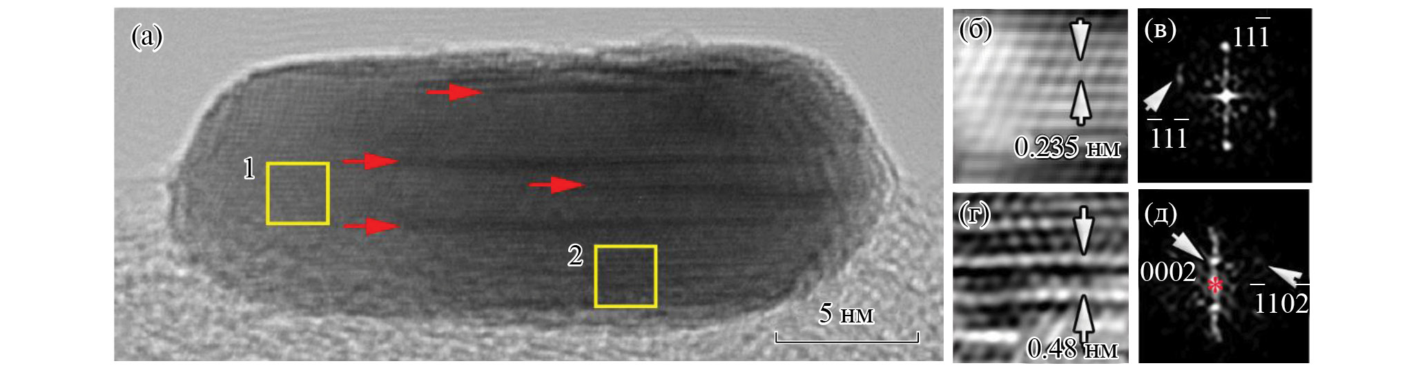 На следующем этапе исследования частица была наклонена на 52º в положении гониометра α = 19º. ВРПЭМ-изображение частицы после наклона представлено на рис. 4. После наклона частицы ее эффективная толщина вдоль электронного луча существенно возросла, поэтому качество изображения упало. Тем не менее ряд особенностей структуры отчетливо проявляется на изображении. Во-первых, это плоские дефекты, отмеченные стрелками на рис. 4а. Во-вторых, неровности верхней и нижней поверхностей, которые согласно предположениям [31, 32] могут быть ответственны за появление 2Н гексагональной фазы в приповерхностных областях. Кроме очевидных особенностей был проведен анализ изображений кристаллической решетки в разных частях частицы и два из них обозначены квадратами и цифрами на рис. 4а. Увеличенное изображение после фильтрации и двумерные спектры Фурье показаны на рис. 4б–4д. Кристаллическая структура области 1 может быть идентифицирована как ГЦК-Au: межплоскостные расстояния и углы между максимумами, определенные из двумерного спектра Фурье (рис. 4в), соответствуют проекции [011] кристаллической решетки. П/РЭМ-изображение после фильтрации (рис. 4г) и двумерный спектр Фурье области 2 (рис. 4д) соответствуют фазе ГПУ-Au. Прослойки ГПУ-Au наблюдались в НЧ в [38–41]. Однако в этих работах наблюдали 2Н ГПУ-Au. В силу недостаточного пространственного разрешения ВРПЭМ-изображения и малых размеров анализируемой области НЧ, представленной на рис. 4а, трудно сделать окончательное заключение о характере ГПУ-структуры в прослойке: это двуслойная – 2Н или четырехслойная структура – 4Н. Кроме представленных выше результатов определения структуры по проекции частицы [5 3] (рис. 3), сравнение расчетной и экспериментальной разницы углов между наблюдаемыми направлениями проекций [5 3] и [10 0] (рис. 4г) показало хорошее совпадение для структуры 4Н ГПУ-Au: расчетная разница – 52.6º, экспериментальная – 52º, т.е. меньше 1º, что соответствует погрешности гониометра ПЭМ. Таким образом, можно заключить, что микроструктура треугольных и шестиугольных НЧ – слоистая, причем перемежаются слои ГЦК-Au и 4Н ГПУ-Au. Дополнительные доказательства слоистой микроструктуры частиц представлены на рис. 5, где слои в НЧ, проявляющие разный контраст, наблюдаются особенно отчетливо. Анализ изображения и двумерного спектра Фурье области одного из слоев показал хорошее соответствие структуры с 4H ГПУ-Au в проекции [8 3].