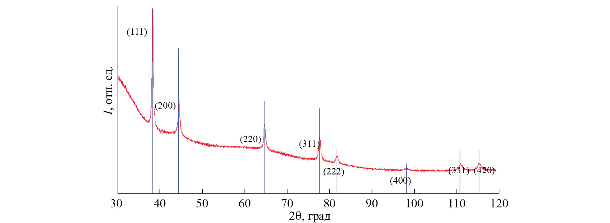 Рис. 7. Дифрактограмма от порошка – высушенного золя с наночастицами золота. Кривая – экспериментальные данные, вертикальные линии – рефлексы, соответствующие ГЦК-Au (PDF-2 03-065-2870)