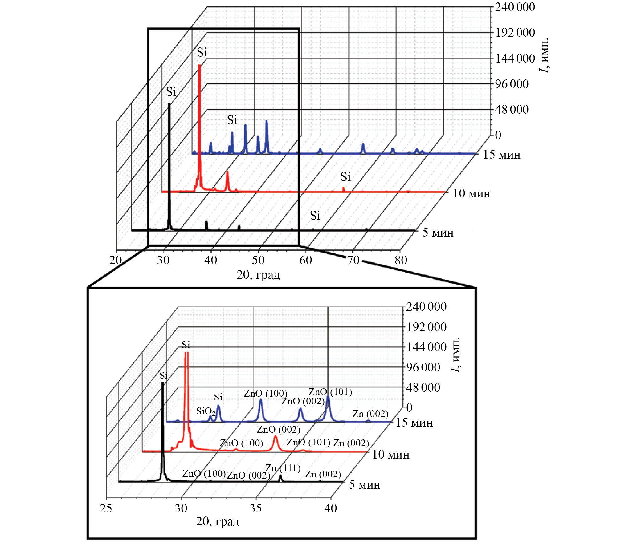 На дифрактограмме образца со временем роста 15 мин присутствует большое количество рефлексов, относящихся к фазам Zn, ZnO, SiO2 и Si. Наиболее интенсивными являются пики ZnO (100), (002), (101). Присутствие высокоинтенсивных пиков ZnO, отличных от (002), говорит о вторичной кристаллизации, подтверждающейся РЭМ-изображениями. Пики SiO2 также являются крайне интенсивными, что говорит о более активном процессе окисления подложки в результате воздействия кислорода. Присутствие малоинтенсивной фазы Zn объясняется наличием поликристаллического слоя, образующегося в начале роста.