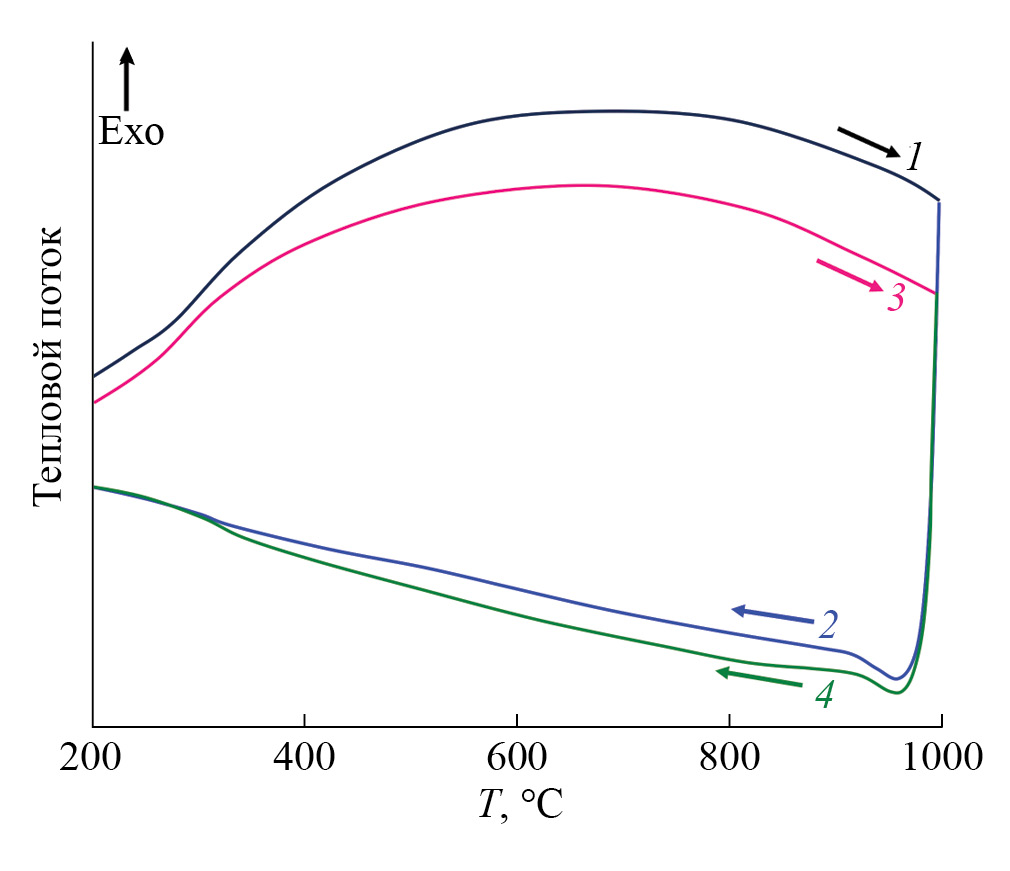 Рис. 3. Данные ДСК для монокристаллических образцов (1 – нагрев, 2 – охлаждение) и керамик LixNd5 – xMo3O16 ± δ, x = 0.05 (3 – нагрев, 4 – охлаждение)