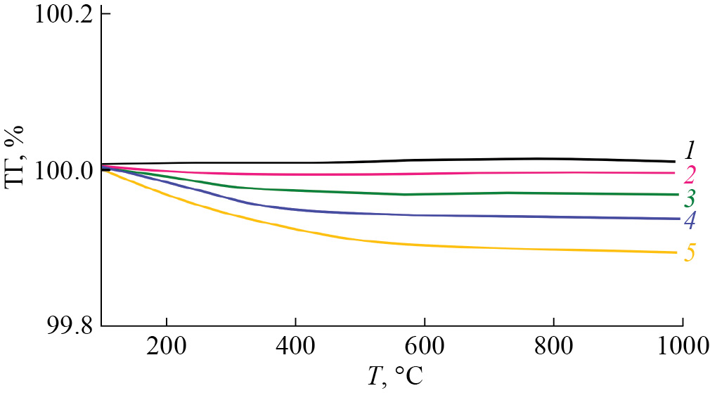 Рис. 4. Данные термогравиметрии (ТГ) для монокристаллических образцов, исходного Nd5Mo3O16 + δ (1) и литированного (2), а также керамик LixNd5 – xMo3O16 ± δ, х: 0 (3), 0.05 (4), 0.15 (5)