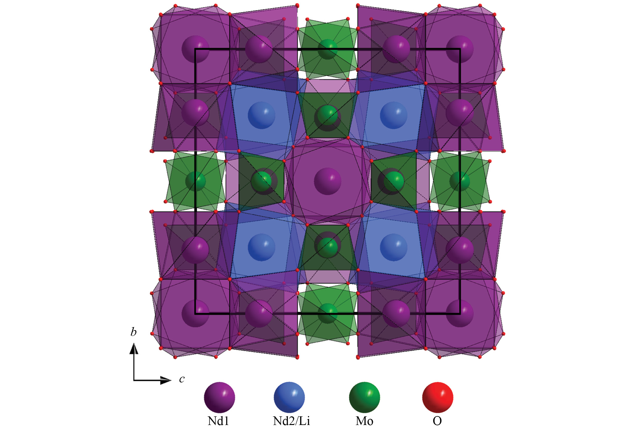 Рис. 5. Проекция кристаллической структуры Li0.216Nd4.784Mo3O14.1 + δ на плоскость bc