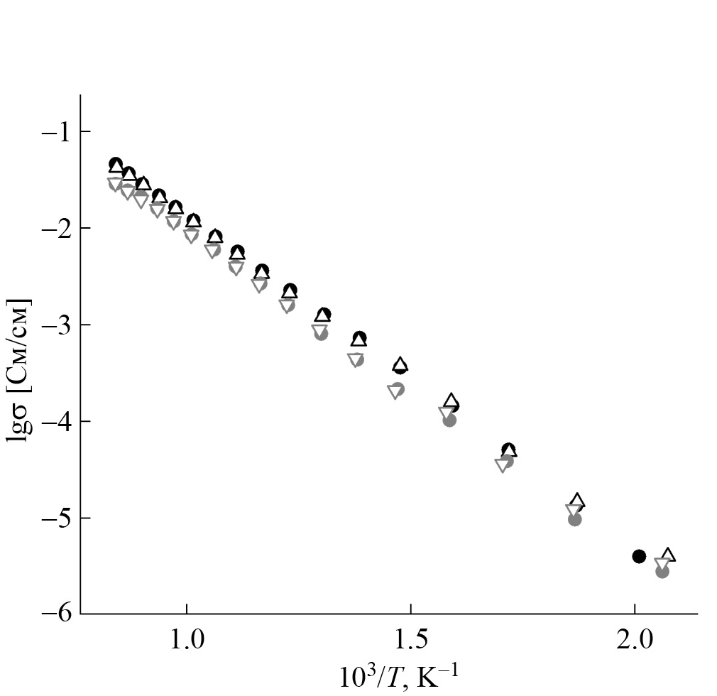 Рис. 6. Температурные зависимости проводимости керамик Li0.216Nd4.784Mo3O14.1 + δ при x = 0, 0.15 (темные и светлые символы соответственно), измеренные в сухом (закрашенные символы) и влажном (пустые символы) воздухе