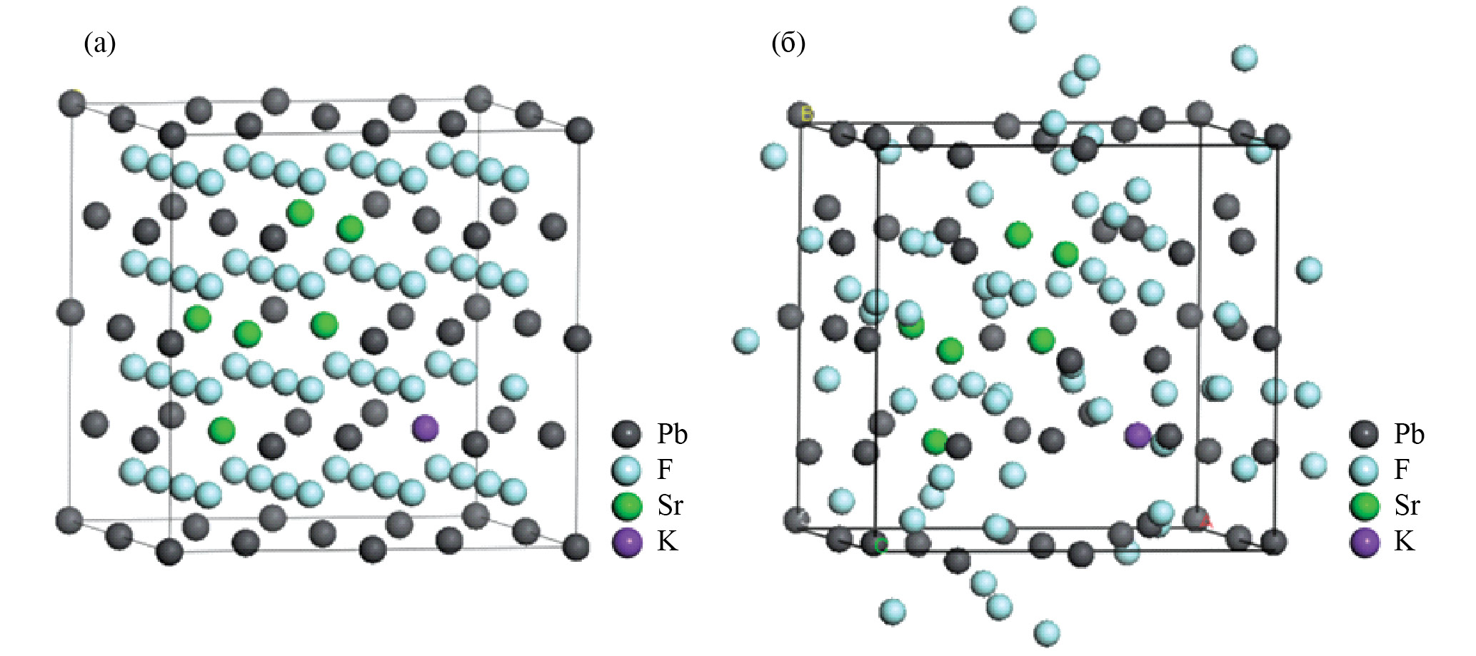 Рис. 1. Расположение атомов в моделируемой системе Pb25Sr6KF63 в начале (а) и после окончания (б) НЭМД-расчетов