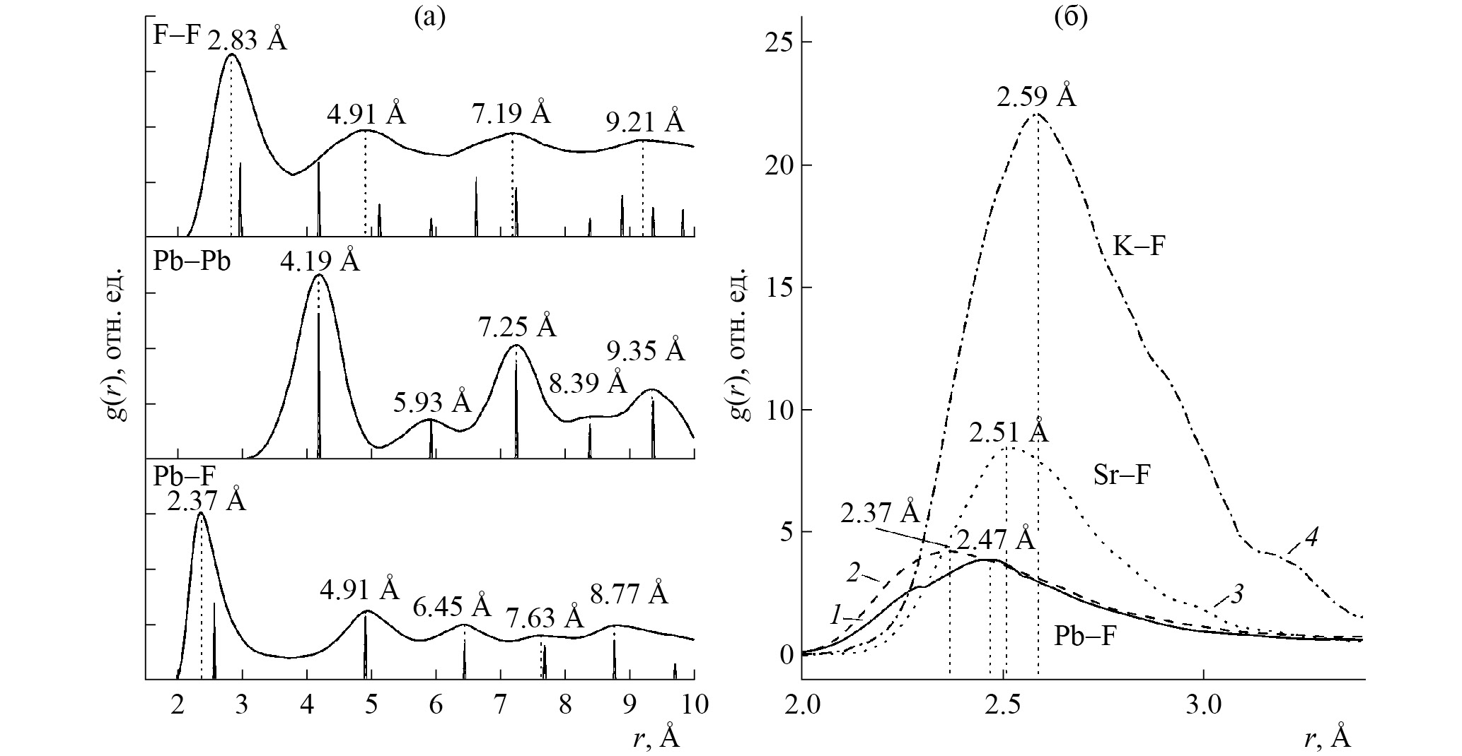 Рис. 2. Радиальные парные функции распределения атомов: пары F–F, Pb–Pb, Pb–F в системе Pb25Sr6KF63 (а). Вертикальные прямые отвечают ситуации идеального кристалла с флюоритовой структурой; пары Pb–F (1) в кристалле β-PbF2, пары Pb–F (2), Sr–F (3), K–F (4) в системе Pb25Sr6KF63 (б)