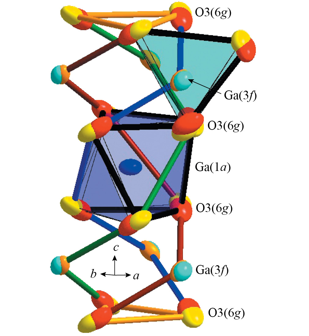 Рис. 10. Конфигурация (в форме эллипсоидов атомных смещений) из атомов Ga(3f) и атомов O3(6g) в соседних ячейках, формирующая трехзаходную спираль в кристалле NGS