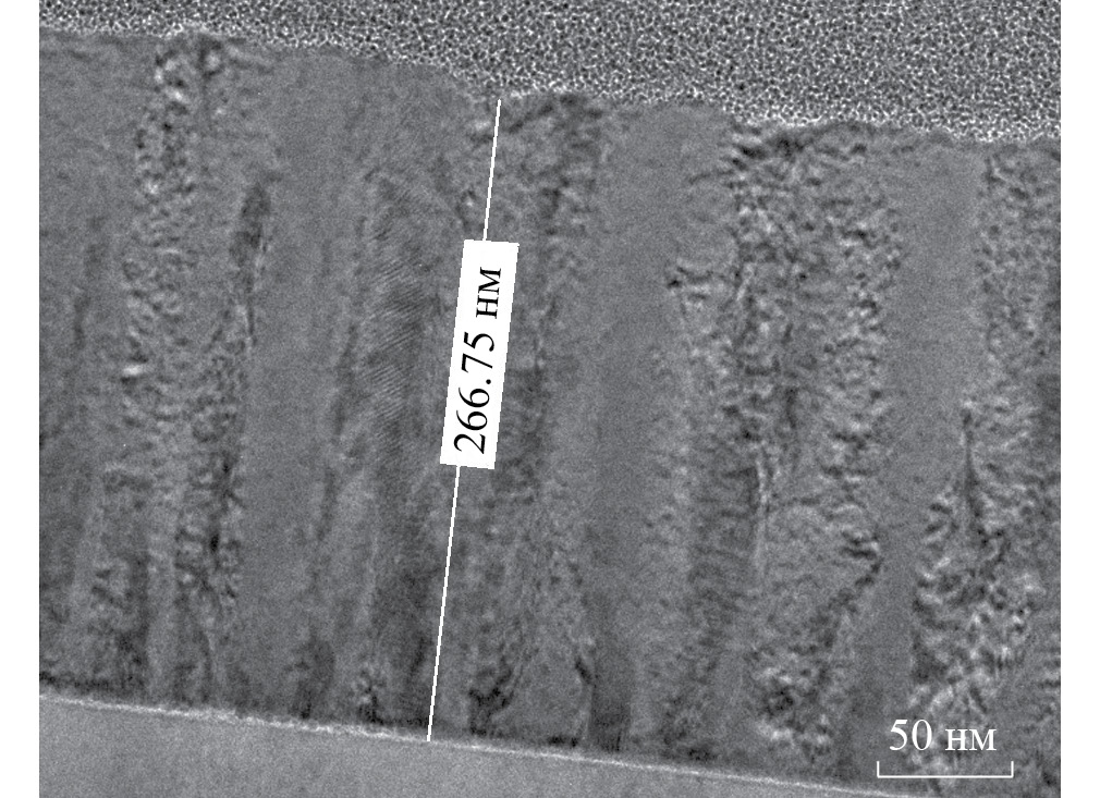 Исследование микроструктуры слоев методом ПЭМ. Методом ПЭМ были исследованы слои ZnO:6%Al, синтезированные при температуре 300°С на подложках термически окисленного с поверхности Si. Уровень легирования слоев (6 ат. %) заведомо превышал величину предельной растворимости Al в ZnO. ПЭМ-изображение слоя ZnO:6%Al (рис. 2) демонстрирует типичную для слоев ZnO столбчатую структуру.