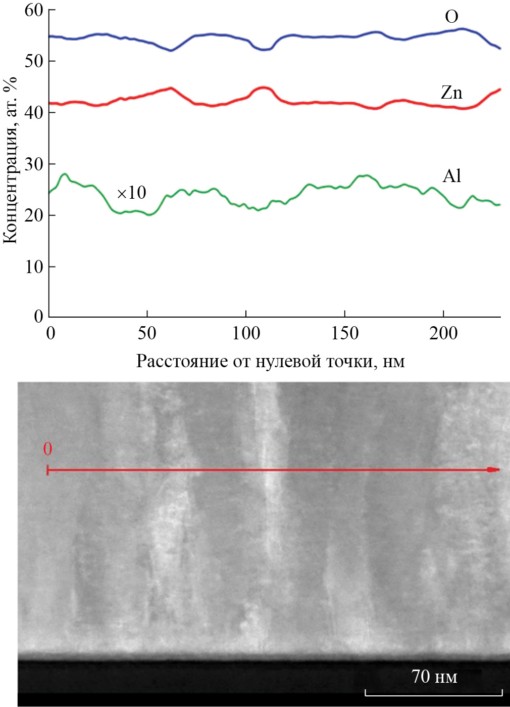 По данным энергодисперсионного анализа примесь локализуется в тонком начальном слое толщиной ~10 нм (рис. 3). Соотношение Al/(Zn+Al) в этом тонком слое вблизи подложки достигало значения 33%, тогда как в толще слоя, вдали от подложки, это соотношение соответствовало исходному содержанию примеси в мишени (6 ат. %). Локализация избыточного алюминия на границе с подложкой связана с относительно высоким давлением паров цинка, приводящим к его реиспарению с гетерогенной поверхности на начальном этапе роста [19, 20].