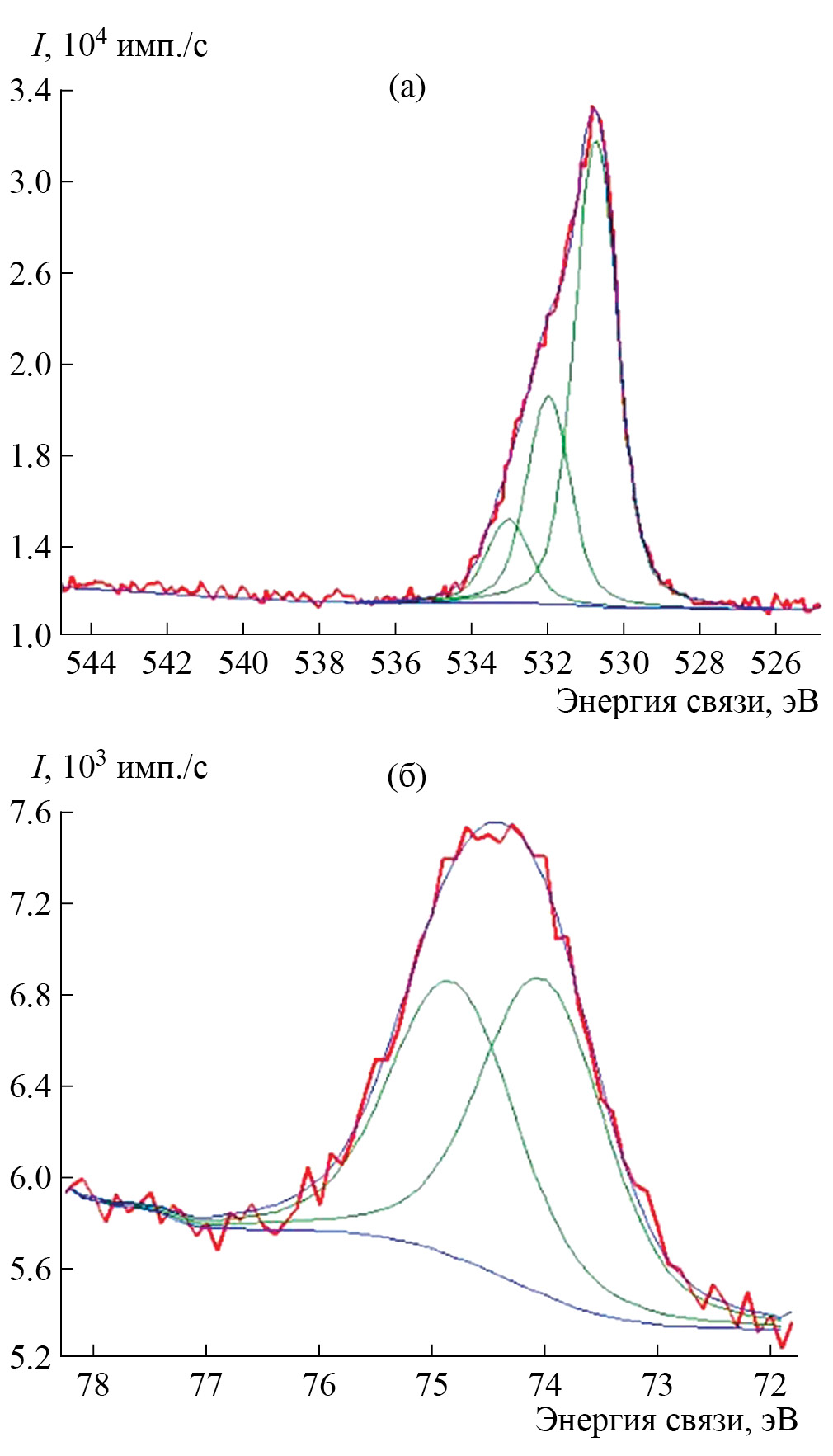 Рис. 7. Области РФЭ-спектра с рефлексами O1s (а) и Al2p (б)