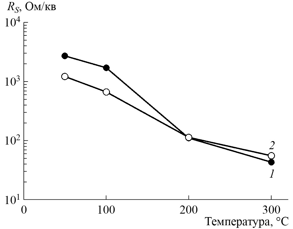 Рис. 8. Зависимости поверхностного сопротивления RS слоев ZnO:3%Al (1) и ZnO:6%Al (2) от температуры подложки