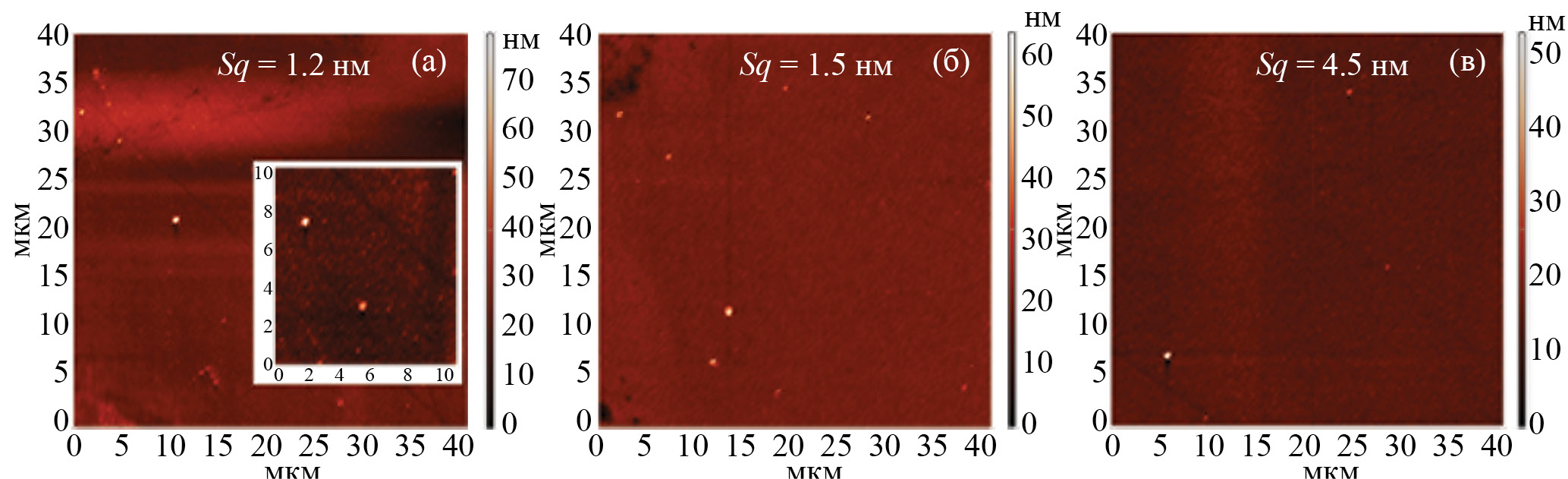 На рис. 3 и 4 представлены АСМ-изображения выращенных пленок. Тонкие пленки CdTe состоят из крупных кристаллитов размером ~500 нм для пленок, выращенных на Al2O3, и ~150 нм для пленок, выращенных на Si. В случае тонких пленок, выращенных на сапфире (рис. 3), присутствуют также крупные кристаллиты размером ~1.5 мкм, имеющие огранку, отличную от основного массива кристаллитов. Соотнося полученные данные с данными РФА-анализа (рис. 2б), можно предположить, что данные кристаллиты могут иметь структуру гексагональной фазы вюрцита CdTe. При этом тонкая пленка CdTe, выращенная на Si, имеет меньшую среднеквадратичную шероховатость (Sq) по сравнению с тонкой пленкой, выращенной на Al2O3. Связано это как с наличием на последней крупных кристаллитов, предположительно гексагональной фазы, так и с большими размерами кристаллитов основного массива. Различие в размерах кристаллитов основного массива связано, предположительно, с разной теплоемкостью материалов подложек Si и Al2O3, что может значительно влиять на процессы кристаллизации.