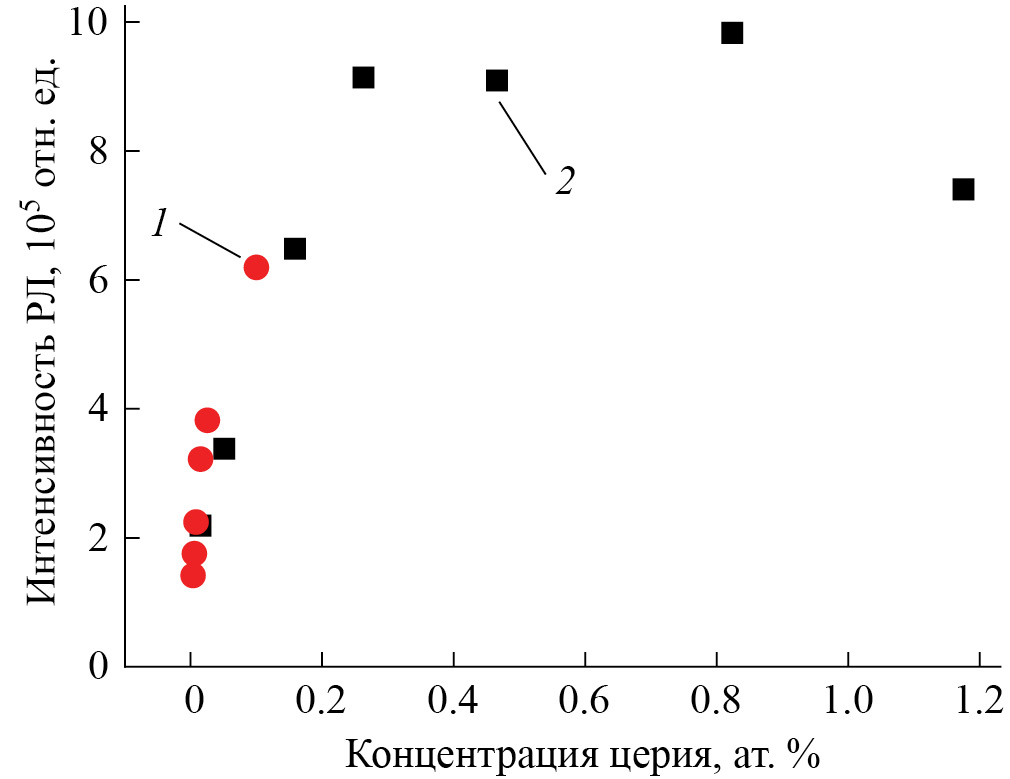 Рис. 3. Зависимость интенсивности РЛ кристаллов ИАГ:Се на длине волны λ = 560 нм кристаллов от концентрации активатора: 1 – кристаллы, выращенные методом ГНК, 2 – кристаллы, полученные при спонтанной кристаллизации