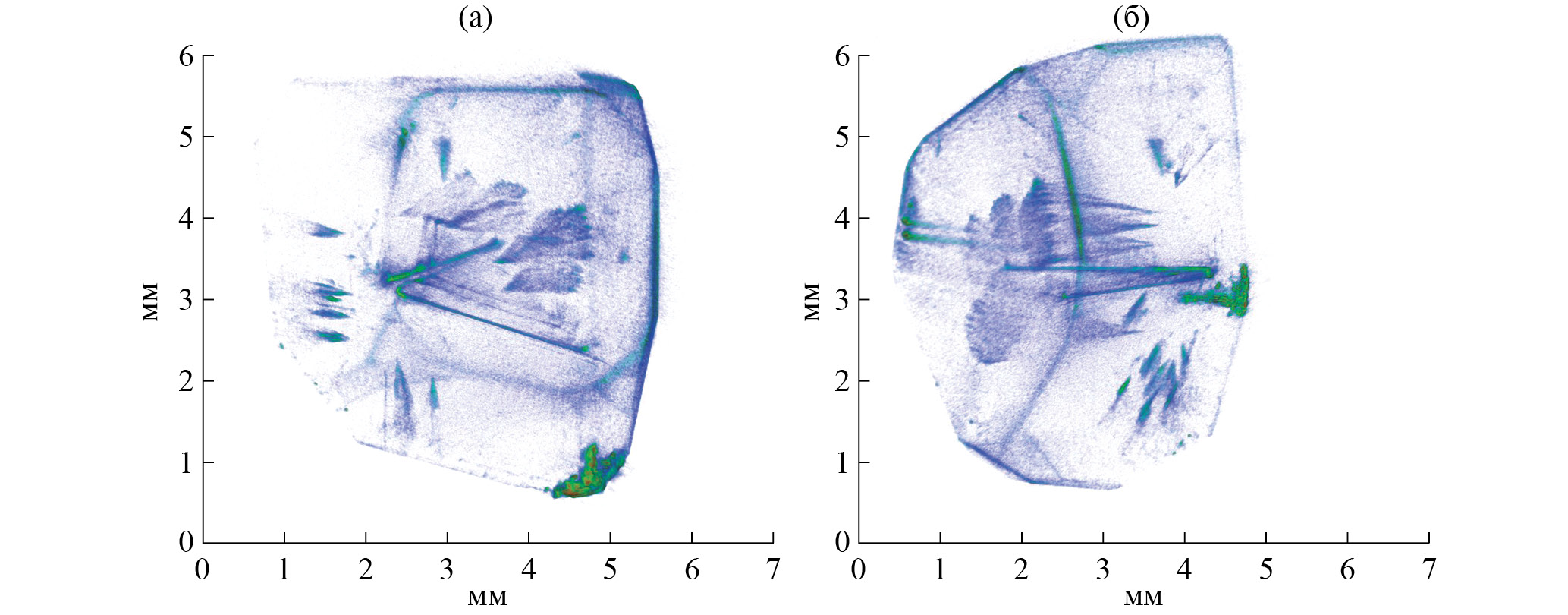 Результаты восстановления отражательной способности кристалла представлены на рис. 4. Полученный объем данных и проведенные оценки позволили более детально изучить строение дислокаций. Установлено, что глубина залегания дефекта не превышает 150 мкм, полная длина составляет ~700 мкм, в то время как длина среднего участка дислокационной полупетли ~350 мкм. Отметим, что для уточнения этих параметров требуются более высокое пространственное разрешение и мощные источники рентгеновского излучения. Тем не менее для некоторых практических целей, а именно установления пространственного расположения дефектов и их трансформации при различных внешних воздействиях, достигаемого разрешения ~10 мкм вполне достаточно [10, 11].