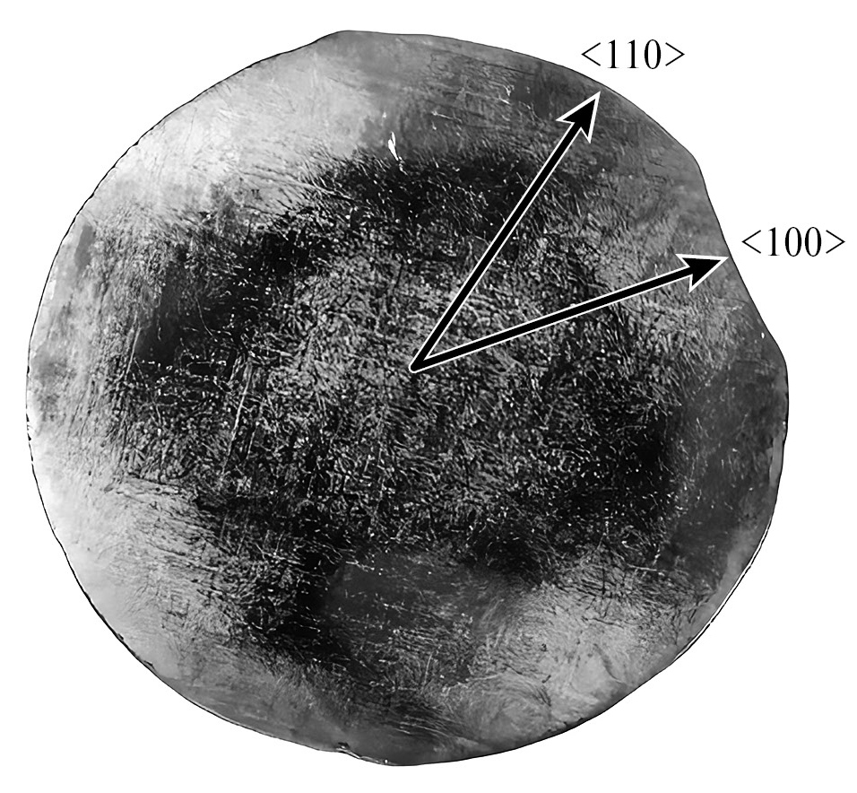 Шайбы для определения плотности дислокаций и пластины, вырезанные параллельно оси роста, механически шлифовали, а затем химически полировали в травителе состава H2SO4:H2O2:H2O = 3:1:1 до получения зеркально гладкой поверхности. Для выявления дислокационных ямок травления использовали травление в расплаве щелочи КОН при температуре 370°C.