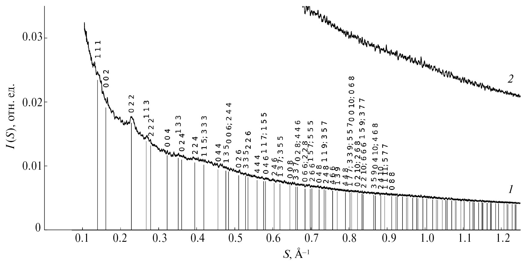- Средняя объемная концентрация атомов в образце. Для стехиометрического состава (CF2), атомных масс (табл. 2) и плотности контрольного образца 2.16 г/cм3 ее значение составляет ρ0 = 0.07803 ат./Å3. Поскольку плотность контрольного образца может не точно соответствовать плотности образца, подвергнутого электронографическому исследованию, были проверены выкладки для всего диапазона плотности 2.1–2.25 г/cм3. Какие-либо принципиальные разночтения между полученными результатами отсутствовали (имели место только незначительные количественные корректировки, принципиально не влияющие на представленные далее рассуждения).