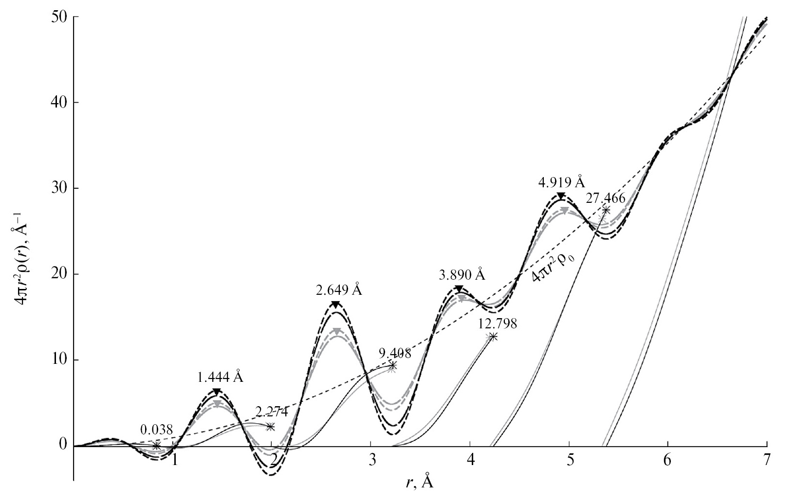 Рис. 8. ФРР атомов в структуре ПТФЭ, расчеты выполнены для верхнего предела интегрирования s2 = 6 Å–1, b = 0.005 и 0.01 Å2 (мелкий и крупный штрихи соответственно). Cплошные линии – интегральные кривые для каждого пика, b = 0.006 Å2 (в диапазоне 0.005–0.01 Å2 результаты близки), звездочки указывают значения интегралов, треугольниками обозначены координаты максимумов (“координационные радиусы”). Темные и светлые кривые – расчеты для первого и второго координационных пиков соответственно (различия в координационных числах и радиусах малы). Пунктир – средняя плотность 2.16 г/см3.