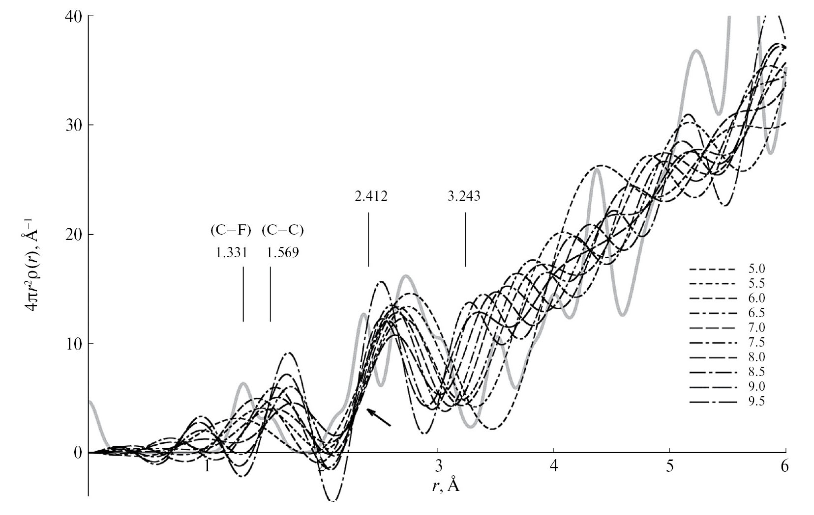 Рис. 9. ФРР для аморфной фазы ПТФЭ, построенные при различных верхних пределах интегрирования s2 (Å–1). Стрелкой указана область совпадения ФРР, соответствующая минимальному расстоянию 2.412 Å между атомами соседних полимерных цепочек ПТФЭ в кристаллической фазе. Сплошная линия – теоретическая кривая (рассчитанная по рентгеновским данным [5]) для кристаллической фазы. Вертикальными линиями отмечены те же межатомные расстояния, что и на рис. 2 для структуры кристаллической фазы ПТФЭ.