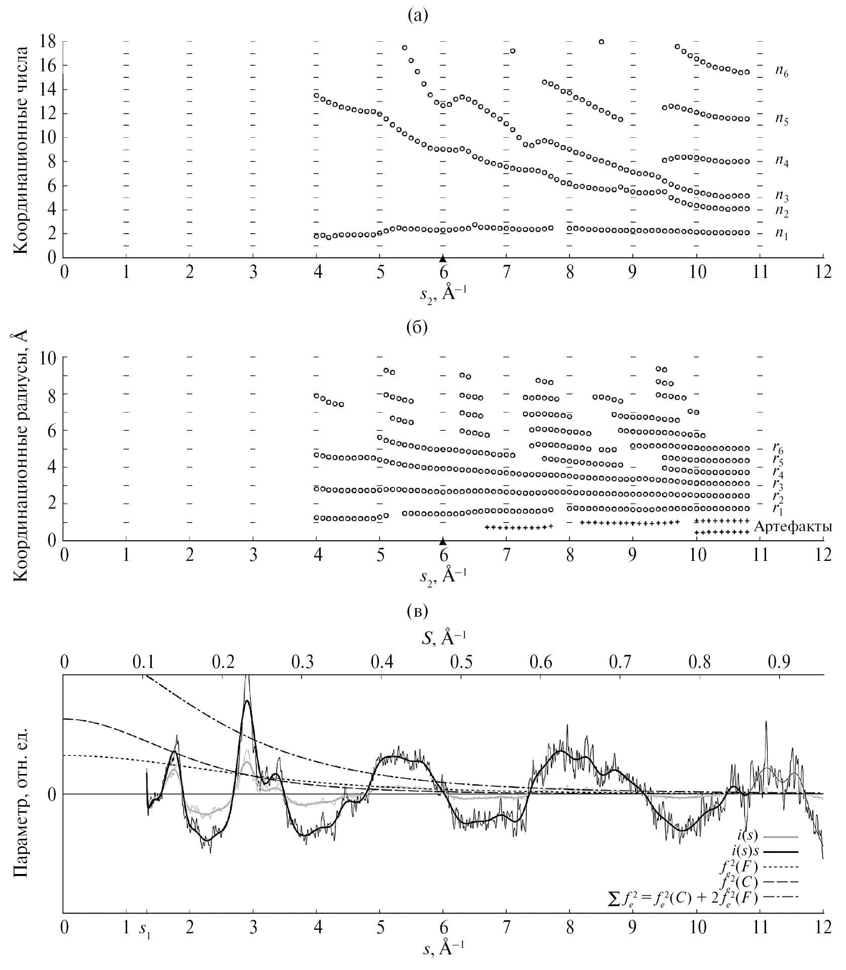 Рис. 10. Зависимость от верхнего предела интегрирования s2: а – координационных чисел (площадей под пиками на графиках ФРР), б – координационных радиусов (абсцисс максимумов пиков на графиках ФРР); треугольником отмечено значение s2 = 6 Å–1, дающее наилучшее соответствие горизонтальных смещений первых пиков с теоретической ФРР, построенной для кристаллической фазы ПТФЭ (рис. 9). Для каждого значения s2 в расчетах использованы данные из промежутка интегрирования [s1, s2] в уравнении (1). Сводка данных, входящих в подынтегральное выражение в уравнении (1) (в). Для наглядности все графики построены в одном масштабе по оси абсцисс, одни и те же значения шкал абсцисс s2 расположены точно друг под другом.