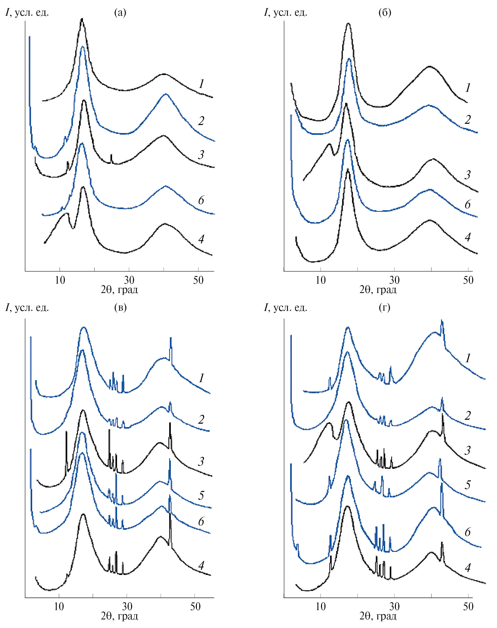 Дифрактограммы фторкаучуков СКФ-26 и СКФ-32 наряду с угловыми зависимостями интенсивности аморфного рассеяния с максимумами при 2θ = 39.94° и 39.52° содержат интенсивные рефлексы с максимумами при 2θ = 16.55° и 17.14° (рис. 1а, 1б, кривые 1). Рефлексы обусловлены упорядоченными образованиями размером 4 и 5 нм со средними межплоскостными расстояниями 5.36 и 5.17 Å соответственно (далее основные рефлексы СПЛ). Основанием для этого являются дифрактограммы, рассмотренные в [29], а также ЭПР-спектры радикала ТЕМПО во фторкаучуках (табл. 1). Небольшие средние межмолекулярные расстояния в СКФ-32 (2.28 Å) и СКФ-26 (2.26 Å) объясняются, в частности, высокой энергией когезии [15] и высоким содержанием плотных областей, особенно в СКФ-26.