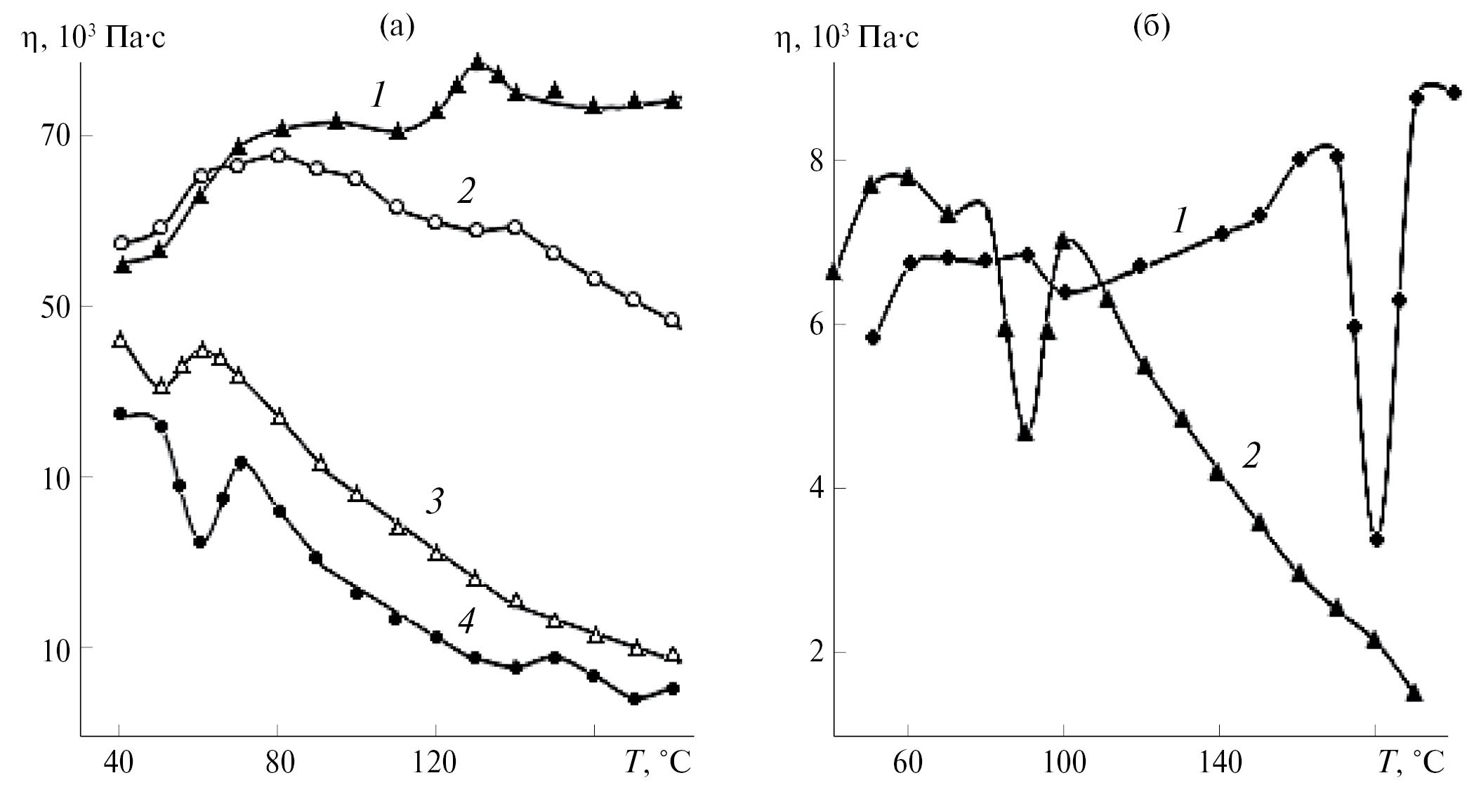 Рис. 2. Температурные зависимости динамической вязкости СКФ-26 (1), СКФ-32 (2), В-60 (3) и В-20 (4). Амплитуды деформации: 0.5° (а), 6.95° (б). Частота 0.8 Гц.